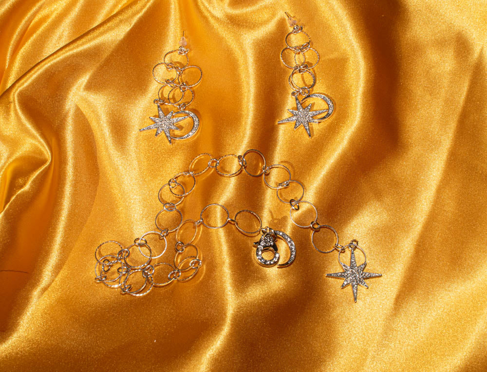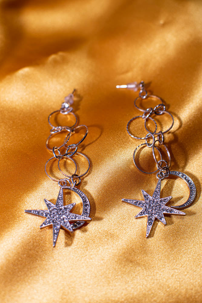 Earrings - Circular diamond cut silver chain attached North Star charm at one end, a moon charm at the other end. Total of 6 circles in length, 3 circles overlap with North Star over the moon.