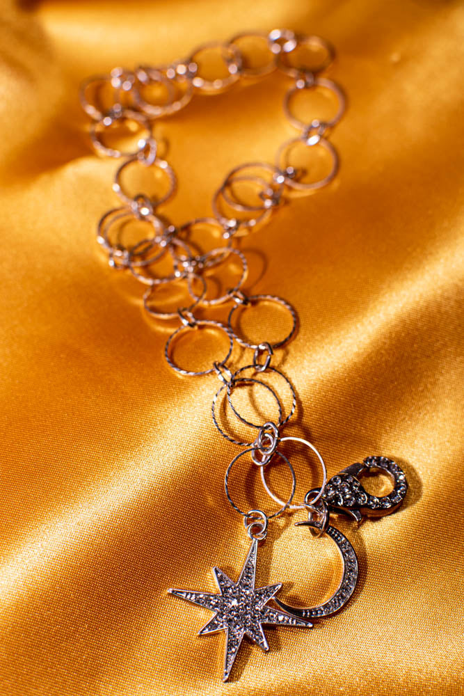 Necklace - 16in. Circular diamond cut silver chain attached North Star charm at one end, a moon charm and small rhinestone lobster clasp at the other end. Also can be worn as a wrap bracelet.