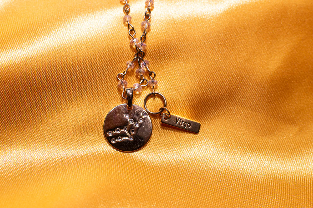 30 in. gold linked crystal accented chain with gold Swarovski zodiac astrology charm on one end and gold Swarovski zodiac name plate charm on the other end. Versatile, can be worn as a hair decoration.