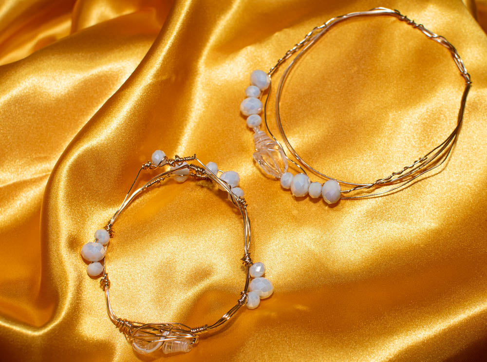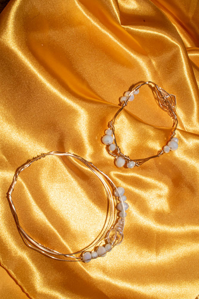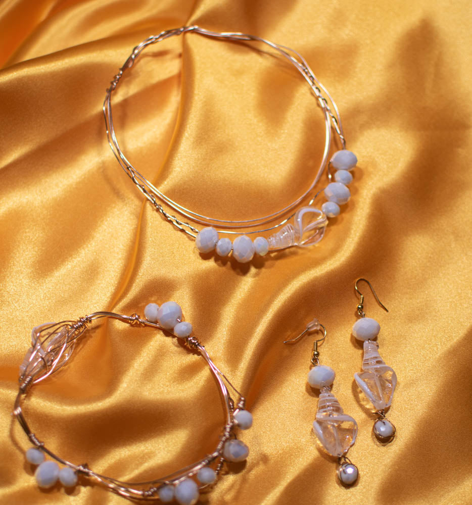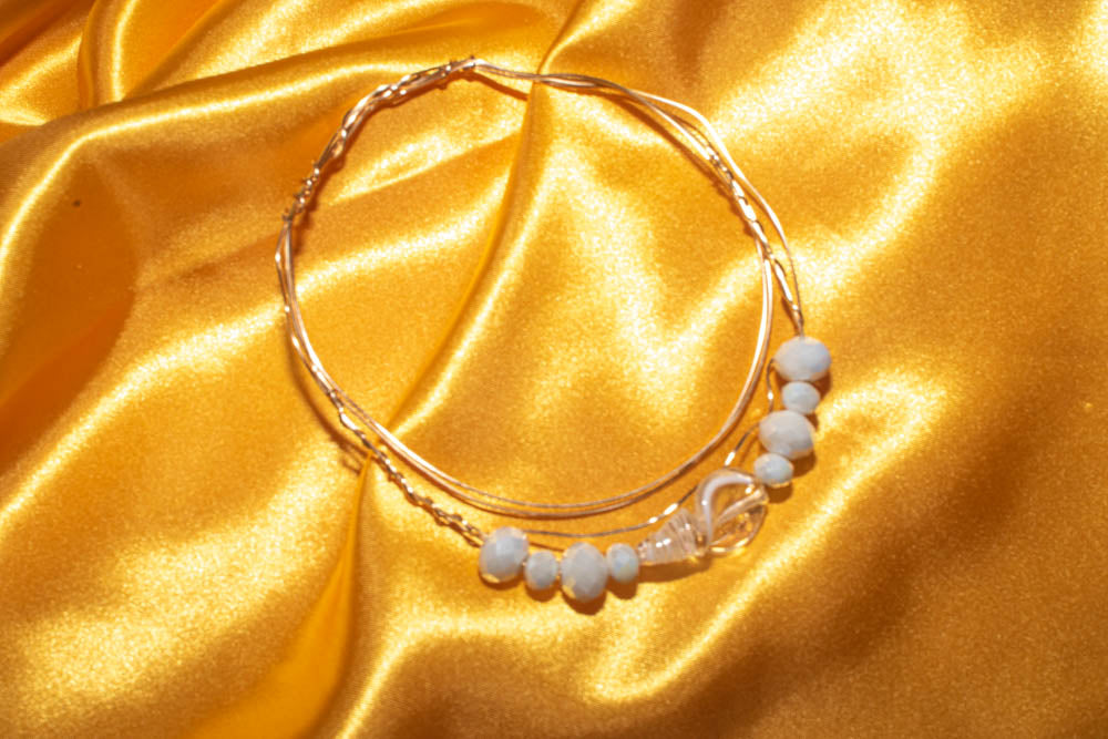 Arm band - Gold wire wrapped with a translucent and opaque white swirl shell shaped bead accented with iridescent opaque white faceted beads.
