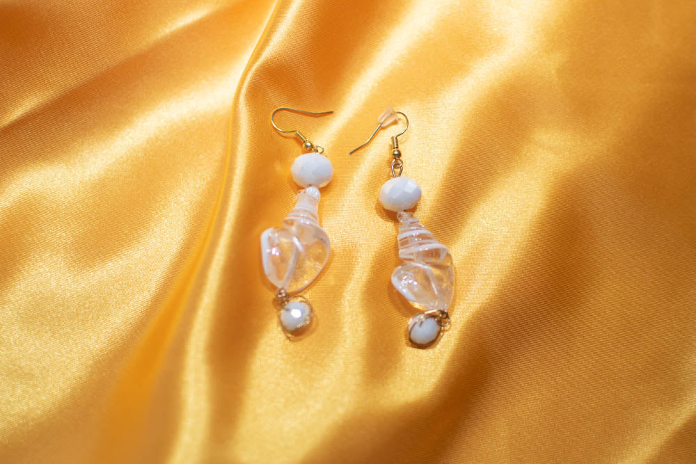 Earrings -Gold nickel free posts with a translucent and opaque white swirl shell shaped bead accented with iridescent opaque white faceted beads.