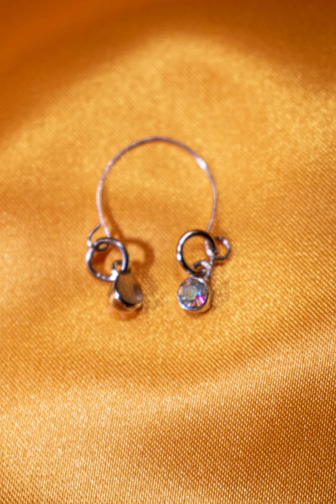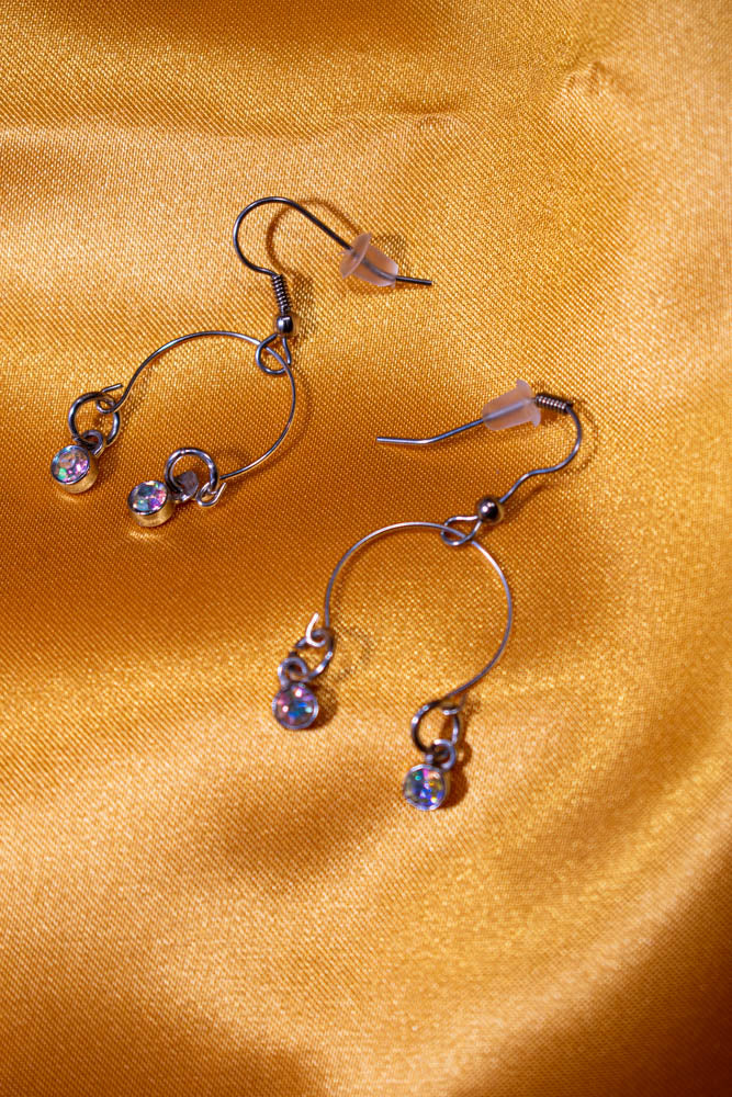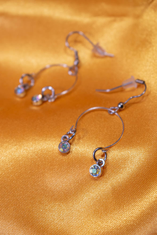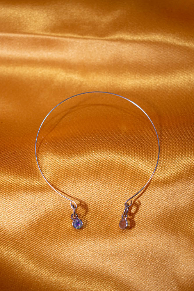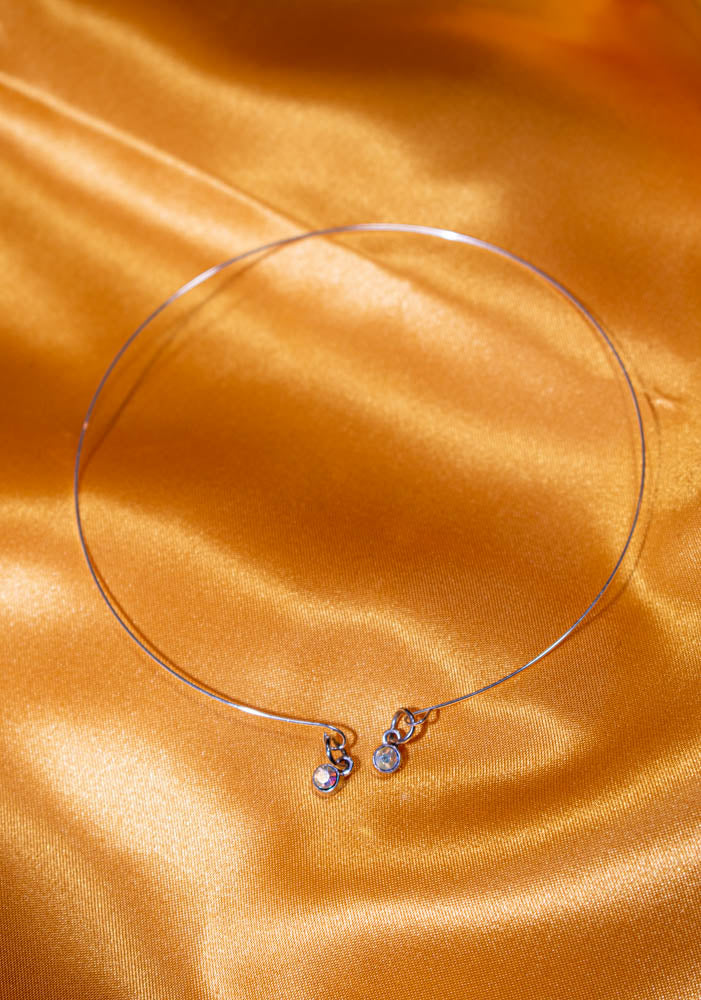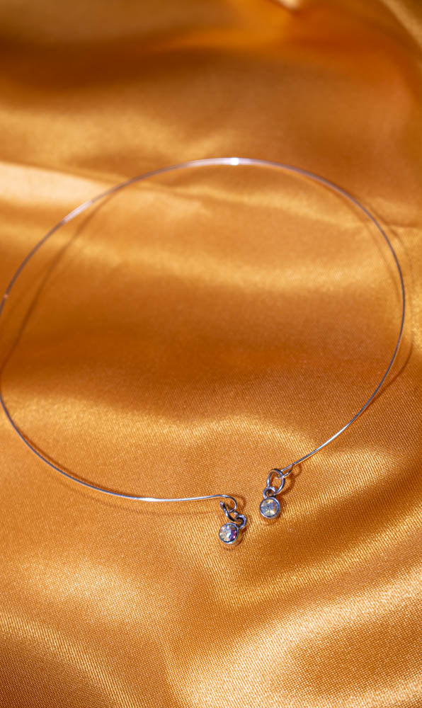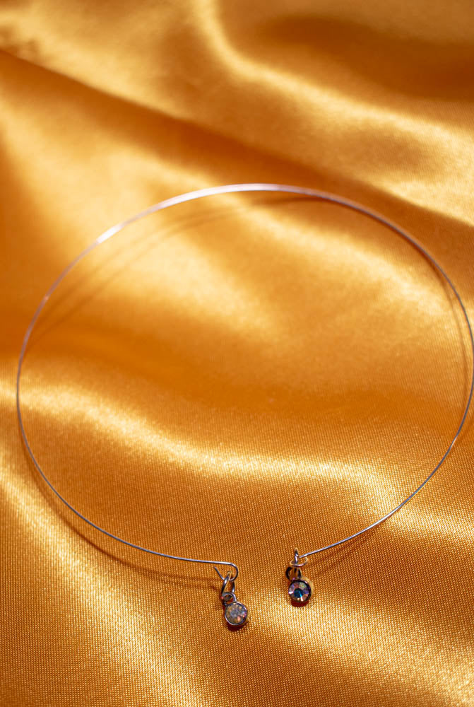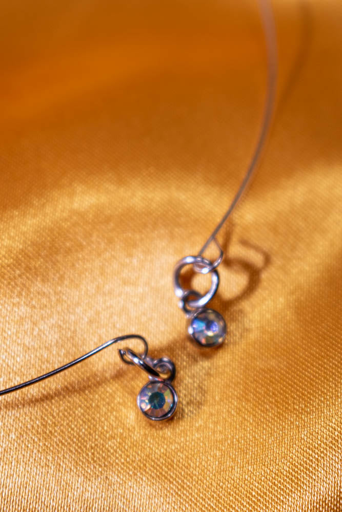 Memory wire accented with dangling iridescent stones In silver. Adjustable necklace, bracelet, ring and earrings with nickel free posts.