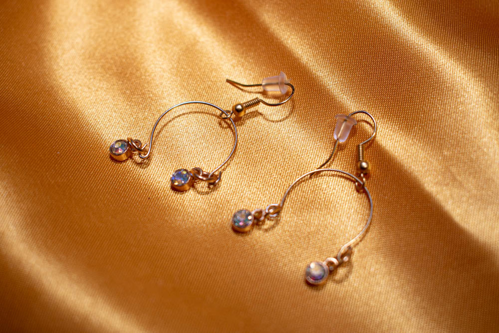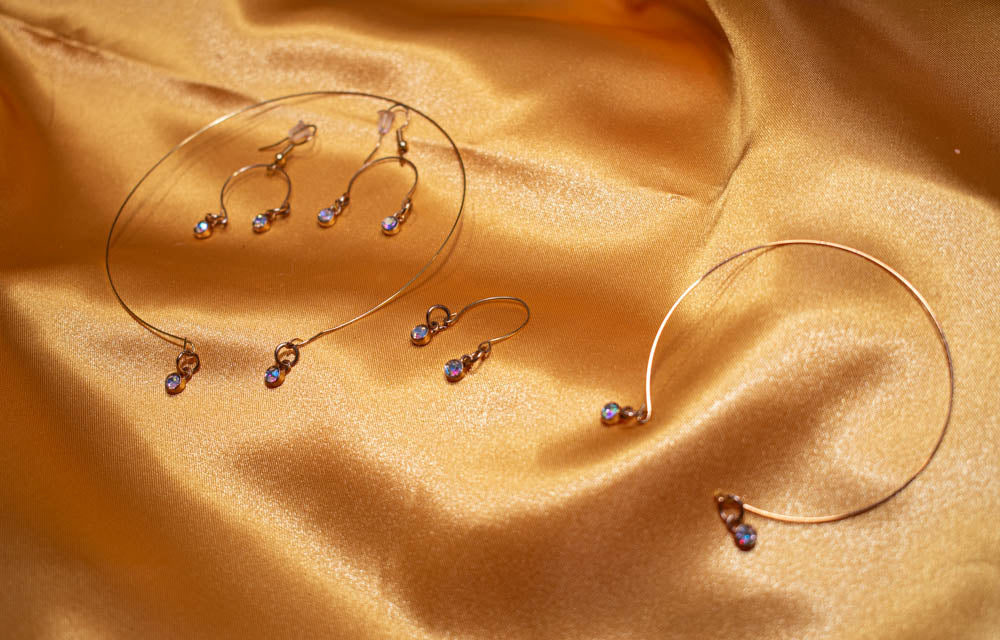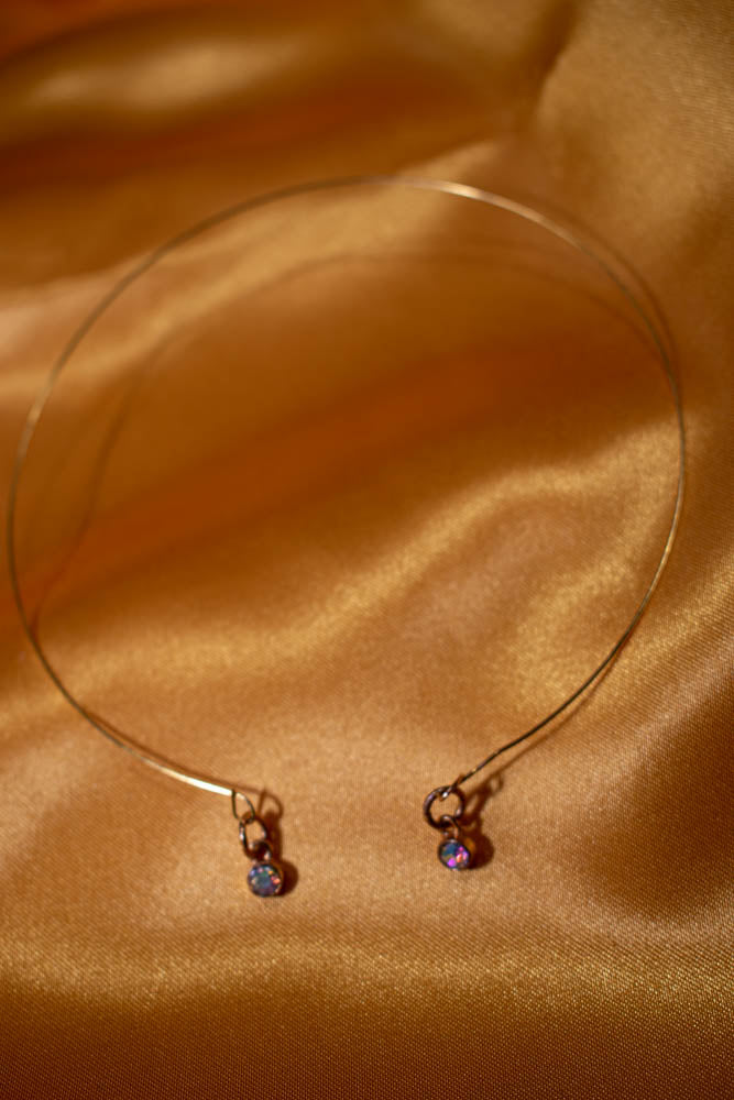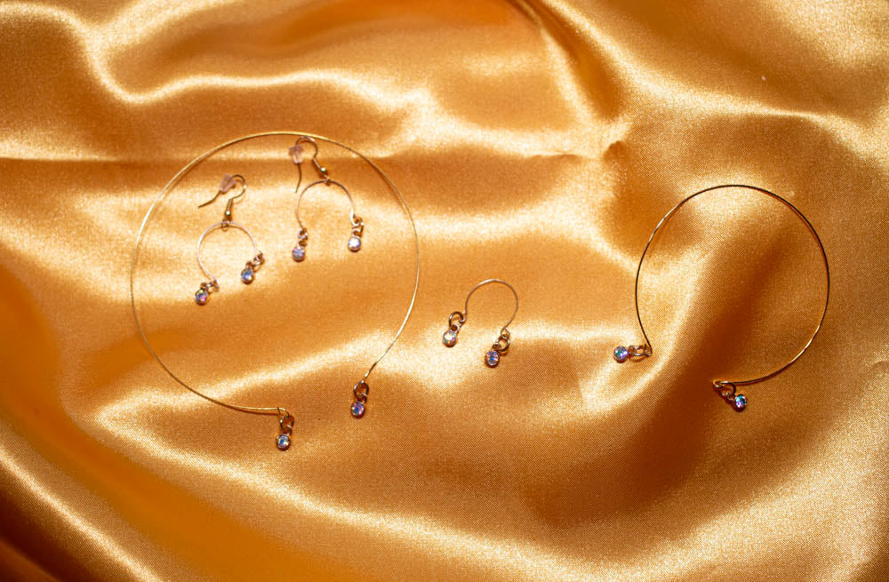 Memory wire accented with dangling iridescent stones In gold. Adjustable necklace, bracelet, ring and earrings with nickel free posts.