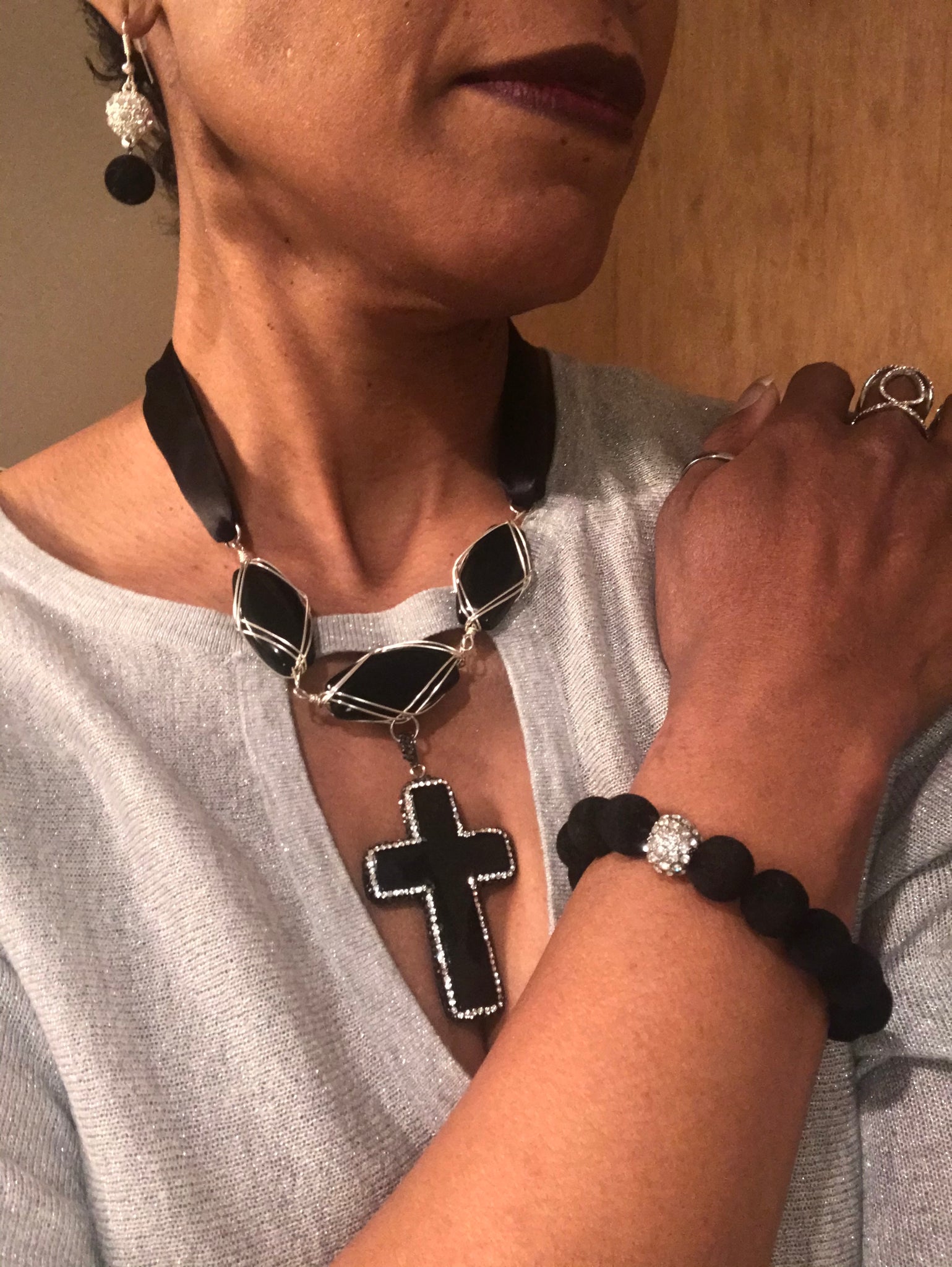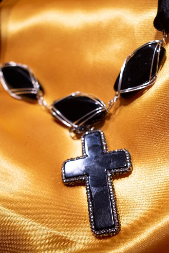 Necklace - 12 in. Black ribbon with rhinestone magnetic clasp attached to three black onyx stone silver wire cover with black onyx cross pendant encrusted black crystal trim.