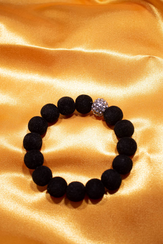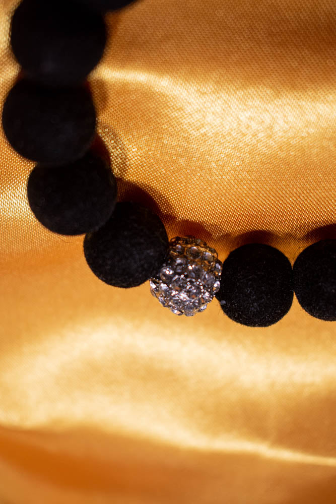 Bracelet - Black velvet coated beads on black elastic cord with a rhinestone accent.