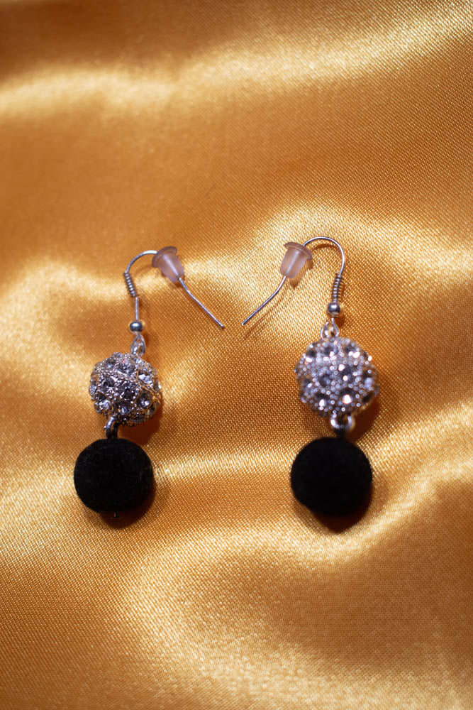Earrings - Black velvet bead attached to a rhinestone magnetic bead with nickel free posts.